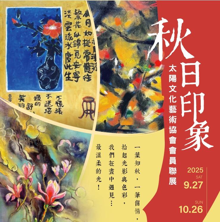 活動內容簡述太陽文化藝術協會今年創會17週年,會員聯展以「秋日印象」為名,呈現多元交融的創作成果。協會秉持包容與開放的理念,支持成員在各自脈絡中持續探索、創作與轉化;此次展出如群星匯入夜空,凝聚為共同的視覺記憶,並勾勒出可被感知的時間感。