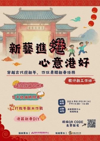 為推廣臺灣傳統表演藝術並深化親子族群對歌仔戲的認識,新藝芳歌劇團於115年新春期間進駐港區藝術中心,規劃「新藝進港・心意港好-歌仔戲新春工作坊」,邀請民眾一同穿越古代,體驗古人迎新納福的年節氛圍。