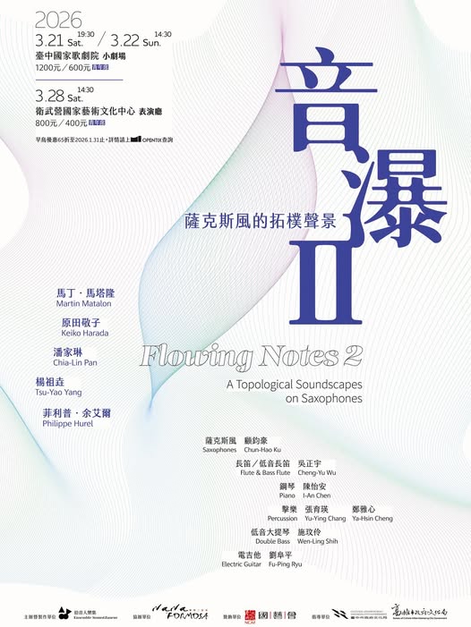 《音瀑 II》邀您一同感受薩克斯風與多元樂器的嶄新能量:當聲音流動、邊界消融,開啟自我意識的想像,貼近當代音樂語言的詩意與脈動,並在東西交融的音場裡,尋找屬於這個時代的「無國界」樂聲。