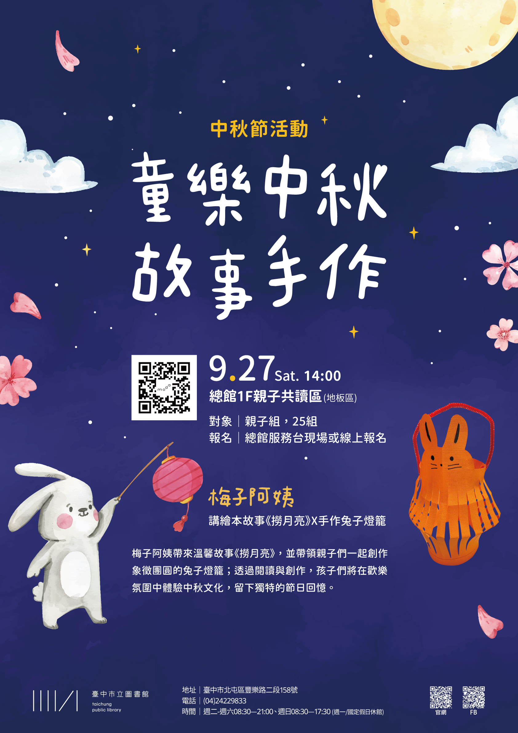 中秋節是團聚的日子,也是親子共享溫馨時光的最佳時刻!臺中市立圖書館精心規劃兩場「童樂中秋.故事手作」活動,邀請大小朋友一起聽故事、做手作,在書香與笑聲中留下最難忘的節日回憶。