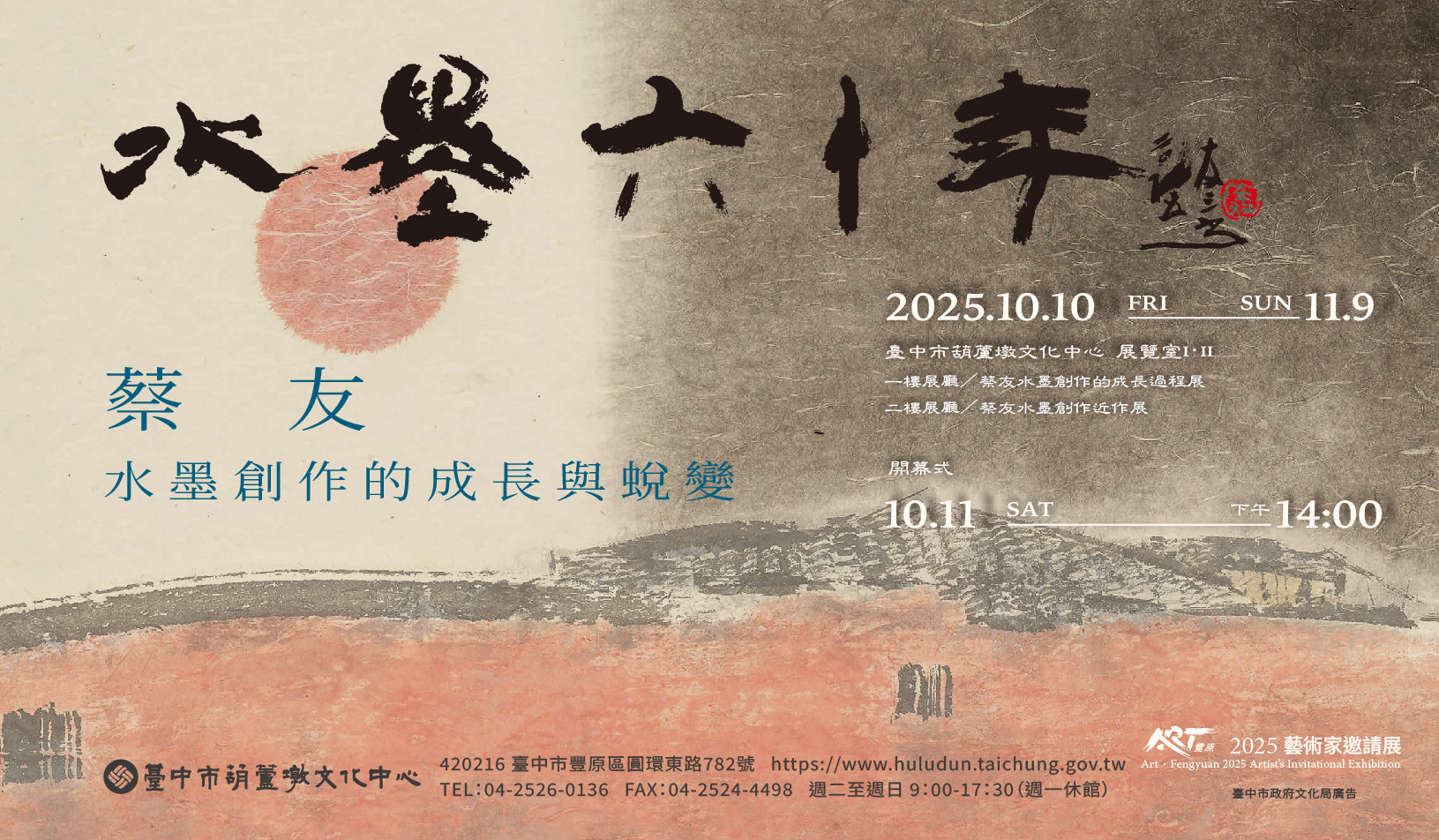 活動內容簡述「ART.豐原藝術家邀請展」由臺中市政府文化局自2016年辦理至今已邁入第10年,每年展出資深前輩藝術家作品,透過其深厚的人生歷練與藝術能量,帶給社會大眾更多關於美的體悟。2025年邀請前國立臺灣藝術大學書畫學系主任蔡友老師,以「水墨六十年-蔡友水墨創作的成長與蛻變」為題,完整呈現蓄積多年的創作成果,帶領觀者走進筆墨流轉的藝術世界。